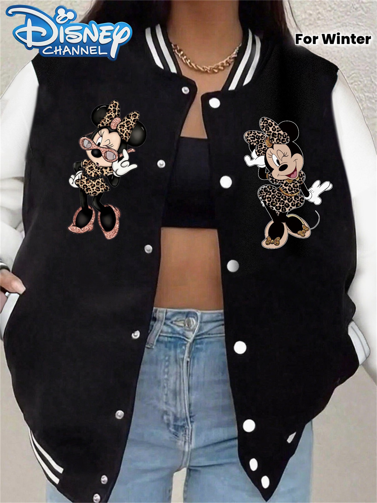 Women'S Vintage Mickey Mouse Decorated Black Bomber Jacket with Sequins - Casual Streetwear, Long Sleeve, Button-Up, Baseball Collar, Fall/Winter Fashion, Casual Streetwear Jacket | Playful Design | Sequin Embellishments