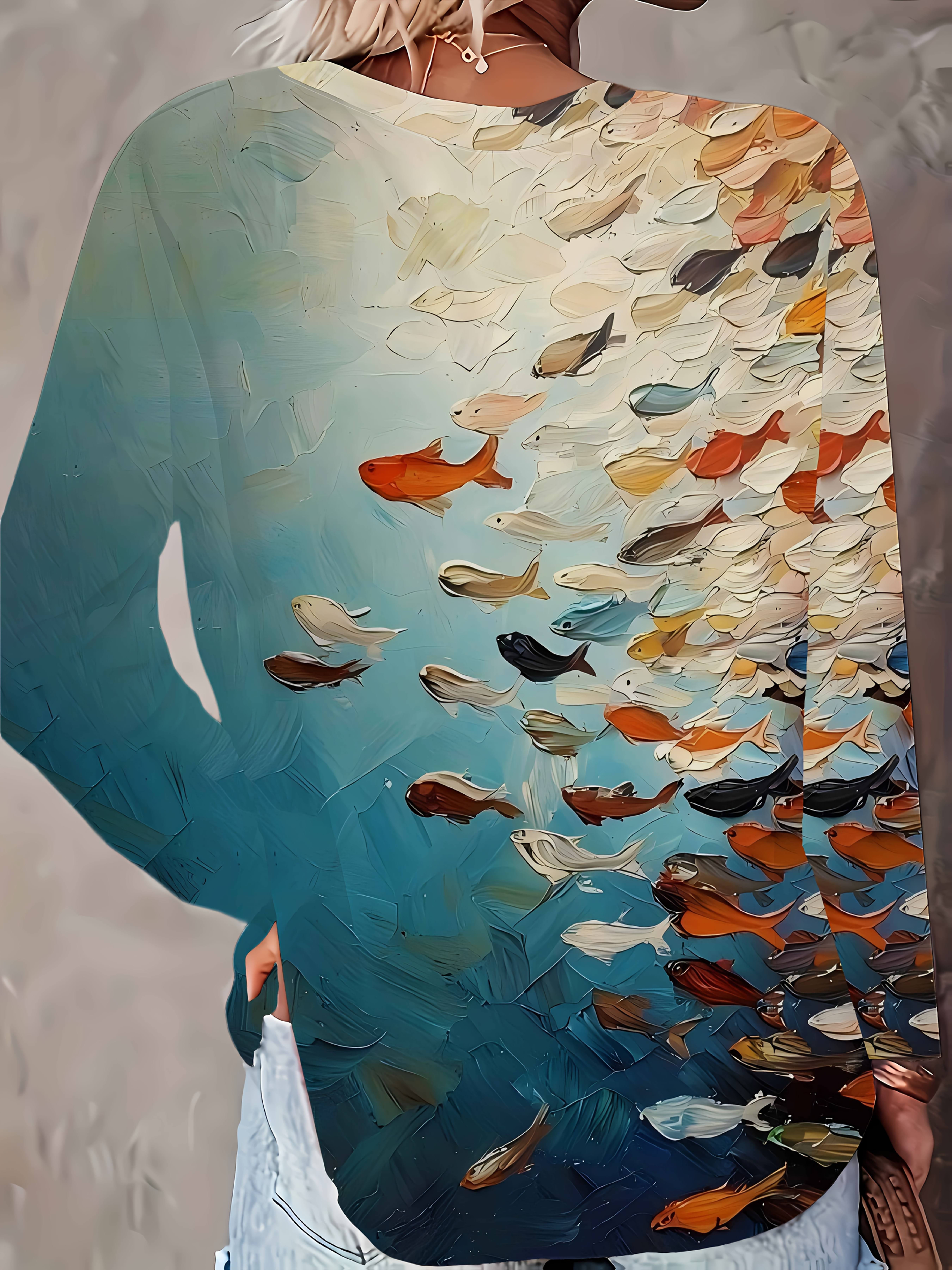 Women'S Long Sleeve Fish Print T-Shirt - Vibrant Ocean Scene with Fish, Coral & Sky Design, Breathable Round Neck Tee for Spring/Fall Casual Wear, Spring Fashion Tee | Vibrant Print Top | Comfortable Fit