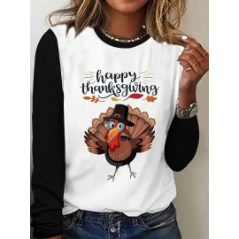 Plus Size, Women's Thanksgiving Turkey Graphic Long Sleeve T-Shirt - Happy Thanksgiving Top with Fall Leaves, White Shirt for Holiday Parties & Everyday Fall Outfits - Machine Washable Casual Women's Apparel