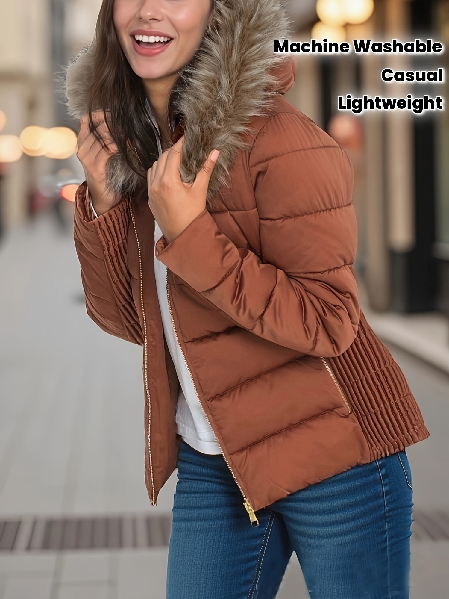 Women's Lightweight Quilted Hooded Jacket with Detachable Faux Fur Hood, Golden Metal Zipper & Side Gathers - Machine Washable Regular Fit Coat for Fall & Winter, Casual Outerwear